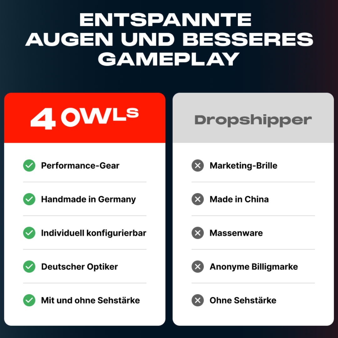 Mit 4 OWLS bringen wir echte Optikerqualität dorthin, wo sie gebraucht wird: ans Setup. Gemeinsam mit eSports-Pros entwickelt, für maximale Performance am Bildschirm – ob beim Arbeiten oder Zocken.